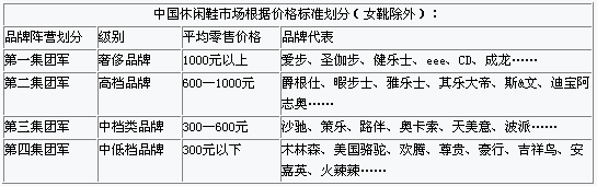 ·在第二集團(tuán)軍里,幾乎是男士鞋的天下,尚未有專業(yè)休閑女鞋品牌在這時(shí)嶄露頭角,這個(gè)價(jià)格水平的鞋類產(chǎn)品被正裝鞋占出了絕大部分空間(如哈森、百麗、富貴鳥(niǎo)、百思圖的部分精品鞋和女靴;說(shuō)明休閑女鞋在這個(gè)價(jià)位還有一定的發(fā)展空間)。