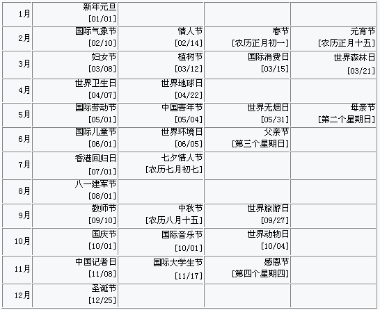 ·全國(guó)性的節(jié)假日促銷策劃有:新年元旦[01/01]、國(guó)際勞動(dòng)節(jié)[05/01]、國(guó)慶節(jié)[10/01]、圣誕節(jié)[12/25]