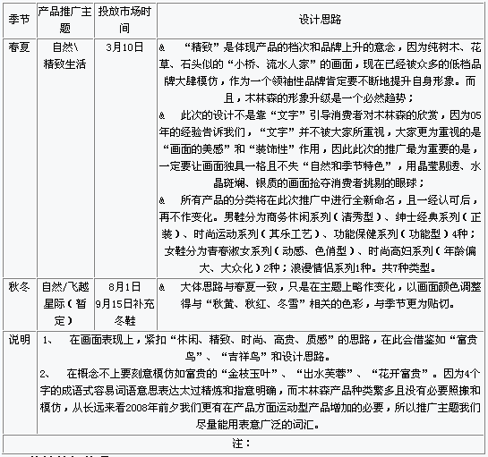 根據(jù)企劃部2004年提交公司的《2005年企劃部工作思路及工作計(jì)劃》,在05年企劃部的工作也經(jīng)歷了近一年,整個(gè)部門在一年工作期間人員得到了充實(shí),經(jīng)驗(yàn)也有了長(zhǎng)足的進(jìn)步。自2005年春夏季產(chǎn)品訂貨會(huì)以來(lái),我們先后對(duì)“木林森”品牌所推廣的“環(huán)保、健康、舒適、都市休閑、商務(wù)休閑鞋專家”的核心理念,分析出眾多的品牌口號(hào)用詞上不夠新穎、不能表達(dá)品牌的情感、產(chǎn)品特性、或是在詞語(yǔ)上缺乏時(shí)代感,不能與時(shí)俱進(jìn)。調(diào)整方向后,我們選用了既與商標(biāo)密切相關(guān),又有時(shí)代感,且不過(guò)時(shí)的“自然”理念,并且通過(guò)產(chǎn)品推廣得到了來(lái)自全國(guó)辦事處和公司領(lǐng)導(dǎo)的認(rèn)同。