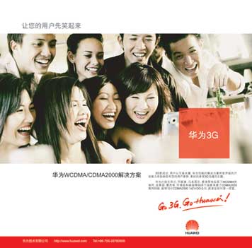 這則廣告最為精彩之處有兩個:一是主體畫面展現(xiàn)了一群人生機勃勃的真實笑臉,配上一句“讓您的用戶先笑起來”的文案,使廣告極具感染力;第二個精彩之處是一個紅色的正方形非常醒目,這個紅色的圖形具有明顯的標識性質(zhì),從而使華為的廣告和其他企業(yè)的廣告產(chǎn)生突出的區(qū)別;第三個精彩之處是在紅色正方形中直截了當?shù)玫莱鰪V告的重點——華為3G。廣告通過富有感染力的人的笑臉和紅色的抽象圖形吸引讀者的注意,進而把廣告目標者的注意力引導到廣告下部的理性信息。如果說這則廣告哪里值得改進以提高廣告效果的話,廣告文案末句“躋身3G第一陣營”是一個可以強調(diào)的要點;當然,這需要有足夠的理由來支撐。