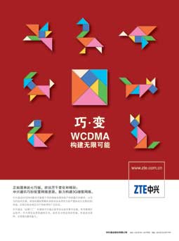 中興通訊的這則廣告可以說是比較成功的。廣告畫面的主體背景非常鮮明地突出了七巧板的富于變化的圖形。七巧板富有創(chuàng)造性和戲劇性的特點是眾人所熟知的,廣告創(chuàng)意人將這一舊元素用于新的主題,從而對中興“WCDMA構(gòu)建無限可能”的“巧”與“變”做了非常精彩的視覺闡釋。廣告的副標題——“中興通訊巧妙配置網(wǎng)絡資源,助力構(gòu)建3G增值網(wǎng)絡”——也比較好地承接了大標題,同時對畫面內(nèi)容做出了比較清楚的呼應和解釋。