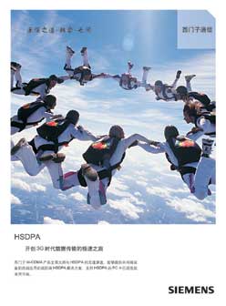 西門子的這則廣告通過一個高空花樣跳傘的視覺表現(xiàn)來吸引讀者對廣告的注意。廣告用高空花樣跳傘來呼應廣告標題“HSDPA開創(chuàng)3G時代數(shù)據(jù)傳輸?shù)臉O速之旅”和文案正文中的“西門子W-CDMA產(chǎn)品全面支持向HSDPA的無縫演進”。可以說,廣告在這種視覺內(nèi)容和文字內(nèi)容的呼應方面是比較成功的。由于該類產(chǎn)品是典型的信息類產(chǎn)品,潛在廣告對象在看廣告時的心理傾向于主動接受,因此廣告其實可以進行更為詳細的解說。在這方面,廣告似乎有更上層樓的余地。