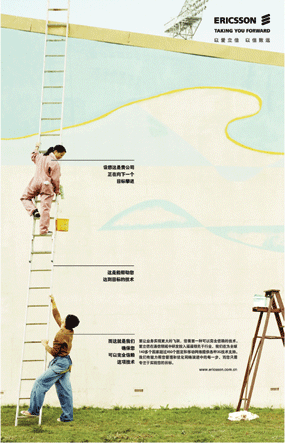 愛立信這則廣告的視覺表現(xiàn)富有生活情趣,整體明快簡潔,對調(diào)動閱讀興趣起到了很好的作用。愛立信在這個廣告中對讀者視覺注意的焦點進行了成功的引導,促使讀者有動力從上到下逐一閱讀廣告文案。同時,廣告利用扶梯子的視覺比喻,傳達了愛立信能夠為客戶提供的有力的、可信賴的幫助與支持。值得補充說明的是,廣告設計稍微顯得過于追求唯美效果,本可以突出強調(diào)的信息沒有通過強有力的大標題得以傳達。