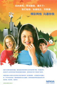 這則諾基亞的廣告可以說是一則企業(yè)形象的廣告。廣告沒有刻意追求新奇,而是以樸素的藝術手法進行了表現(xiàn)。圖案化的視覺表現(xiàn)、流暢線條的運用以及對大面積色塊的運用使廣告風格與一個世紀前著名的“新藝術運動”的設計風格略顯相似。這個廣告的特點使廣告顯示了企業(yè)自信、大氣與穩(wěn)定。廣告畫面中以人物為主體,不禁使人聯(lián)想起諾基亞那句“以人為本”的著名廣告語。廣告大標題“精彩網(wǎng)絡,溝通你我”非常簡潔明快地強調(diào)了企業(yè)能夠帶給客戶的價值。廣告正文中具體強調(diào)了諾基亞可以幫助客戶更快更好地進行移動通信基礎設施建設,對廣告的目標群——高級決策者——進行了直接的訴求。