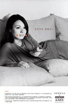 上海貝爾的這則廣告是其系列廣告中的一則。廣告創(chuàng)意人將公司LOGO中的構(gòu)成元素——橘黃色的小三角形——巧妙地用在廣告主角嘴角的兩側(cè),從而對廣告主角的微笑起了極為有效的強調(diào)作用。廣告中的主角選了一位氣質(zhì)高雅、神態(tài)動人的女士。這位女士輕松舒適地斜臥在家中的沙發(fā)上,手中拿著IPTV的遙控器。廣告非常真切地展示了IPTV潛在目標消費者生活的一個片段,使廣告不僅具備情感的感召力,同時也蘊涵了理性的說服力。這種理性的說服力是通過廣告的正文得以加強的。黑白色調(diào)的廣告畫面中,橘紅色的精巧點綴也顯示了廣告創(chuàng)意人的匠心。