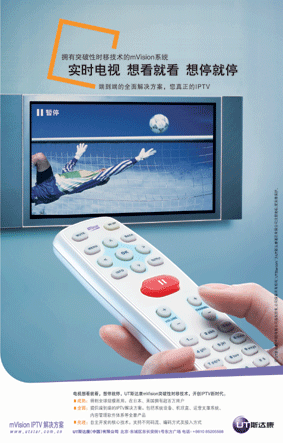 廣告語“實時電視想看就看,想停就!狈浅:啙嵜髁,說明了IPTV能夠帶給消費者的獨特利益。廣告畫面突出了電視搖控器上的紅色暫停鍵,使其成為整個廣告的視覺焦點,很好的呼應了廣告的標題,也呼應了廣告中電視上的“暫!睒酥。我們都知道,一般的電視搖控器是沒有暫停鍵的。UT斯達康通過廣告的視覺內(nèi)容和文字內(nèi)容,強調(diào)了自身的獨特技術,對于潛在消費者很有說服力。如果要提高廣告效果的話,可以對這一獨特的技術做出更為詳細明確的解說。