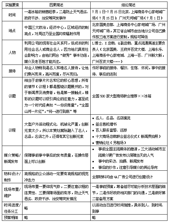 2001年4月,我把上述思路直接同Q副總裁進(jìn)行溝通,他欣然應(yīng)允,并對整個方案作了詳細(xì)問詢和局部建議。 4月初,按計(jì)劃印制了一批邀請函,特別強(qiáng)調(diào)了會議議程安排及會議主題介紹及商務(wù)論壇的性質(zhì),因?yàn)橹挥羞@些綜合因素才是吸引名人、名品的充分條件。當(dāng)以本公司和Q副總裁的名義下函L博士并向其陳述本方案的要領(lǐng)時,L博士表現(xiàn)出了高度的興趣,答應(yīng)百忙之中參與7月在廣州和上海的啟動儀式并且愿意從一個普通消費(fèi)者的角度和一個家庭主婦的角度闡述她本人用本品牌冰箱的體會?梢哉f,在此之前,沒有哪一個企業(yè)請名人一文不花而讓其心甘情愿為企業(yè)作準(zhǔn)戶外商業(yè)推薦而且是從一個普通消費(fèi)者的角度的。作為本次廣場秀活動的精彩之處,我在方案中除了安排L博士演說之外,還特地為其安排了買冰箱簽名贈書活動。并在現(xiàn)場的物料上突出L博士的個人形象及其下屬的××影視制作公司。在得到L博士的肯定回答之后,5月初我們便以本公司、Q副總裁及L博士的名義下函各家電經(jīng)營巨頭。這些家電經(jīng)營巨頭如北京國美、北京王府井百貨、上海永樂、上海商務(wù)中心家電城、廣州新大新、廣百、江蘇蘇寧、山東三聯(lián)等全國前幾十家商場均欣然答應(yīng)參加在北京、上海、廣州舉行的“全國500家大型商場聯(lián)合推薦××冰箱”市場啟動儀式。為了增加對這些經(jīng)銷商的吸引力,我們還每人送營銷管理書籍及L博士大作各一套。