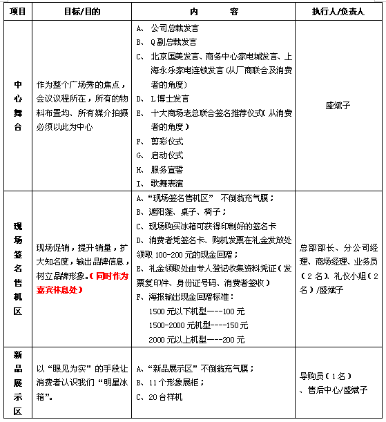 經(jīng)過上述認(rèn)真的分析、研討和籌劃,一個“全國500家大型商場聯(lián)合推薦××冰箱”的市場啟動儀式、推廣活動蓄勢待發(fā)。根據(jù)我們的計(jì)劃,主要的啟動儀式先在北京、上海、廣州三個主要城市啟動,然后將此模式根據(jù)各級省會城市的實(shí)際情況進(jìn)行復(fù)制、移植,由當(dāng)?shù)胤止咀约航M織。原則上由大區(qū)部長領(lǐng)導(dǎo)即可。為了保障活動的組織效果,我們將廣場秀因地制宜分成六大區(qū),每大區(qū)都具體到人,并詳細(xì)說明注意事項(xiàng)。