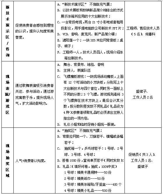 2001年7月1日及7月15日,華南和華東市場啟動儀式按計(jì)劃分別在廣州天河城廣場和上海曲陽商務(wù)中心家電城廣場進(jìn)行。同時為了將公司的“四個第一”殊榮和“十大國家級的冰箱專利技術(shù)”鮮活地展現(xiàn)給消費(fèi)者,圍繞著主題,我還設(shè)計(jì)策劃了系列現(xiàn)場活動和熱點(diǎn),如從消費(fèi)者的角度舉行十大商場老總聯(lián)合簽名推薦儀式;現(xiàn)場購機(jī)簽名贈禮金;新品展示、新技術(shù)展示;現(xiàn)場表演、現(xiàn)場游戲、現(xiàn)場抽獎等,使現(xiàn)場的效果比預(yù)期的還要火暴。下為當(dāng)時廣場秀的現(xiàn)場安排: