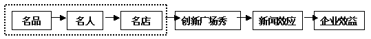 對于此次策劃活動,我初步的創(chuàng)新策略是:名品+名人+名店+廣場秀;暨利用名品的優(yōu)勢吸引、融入名人,利用名人和名品的優(yōu)勢吸引、融入名店,利用名品、名人、名店三者的優(yōu)勢“現(xiàn)身說法”營造創(chuàng)新“廣場秀”,同時在廣場秀中為充分發(fā)揮前三者的整合優(yōu)勢還相應(yīng)引入其它的創(chuàng)新要素。從而產(chǎn)生強(qiáng)大的新聞傳播效果,進(jìn)而達(dá)到宣傳名品的目的,最終實(shí)現(xiàn)企業(yè)的低投入高產(chǎn)出(新聞效應(yīng)、企業(yè)效益)。如下圖所示: