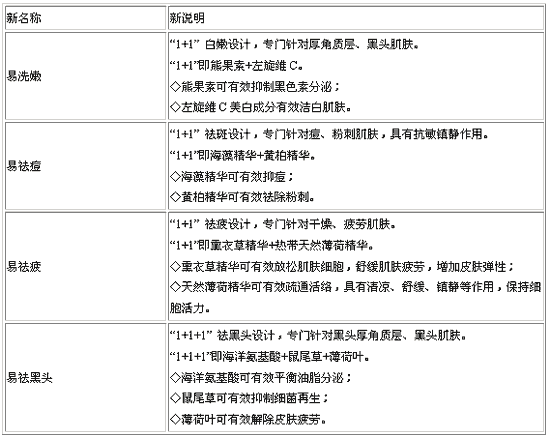 其次,是產(chǎn)品線的調(diào)整;麅z產(chǎn)品針對不同皮膚問題有十幾個品種,但每個產(chǎn)品在功能、訴求概念、產(chǎn)品說明等方面都沒有清晰的差異特點。為此,我們根據(jù)最常見的皮膚問題選擇了四款產(chǎn)品進行重新整合,首先是產(chǎn)品名稱,原來的名稱存在概念不清晰的問題,我們分別把4款產(chǎn)品進行了更加清晰的命名:易洗嫩、易祛痘、易祛疲、易祛黑頭。同時,對產(chǎn)品的功能說明也進行了重新整合!