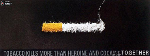 公益廣告————香煙殺人比海洛因和可卡因加起來(lái)還多。海洛因和可卡因拼起來(lái)的香煙形狀,讓文案里的那句話深入人心。