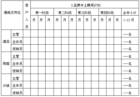 根據(jù)市場(chǎng)容量大小和網(wǎng)點(diǎn)開發(fā)情況,適度適宜地招聘一定數(shù)量的促銷員和業(yè)務(wù)管理員。終端促銷員和業(yè)務(wù)管理員實(shí)施本土化招聘。