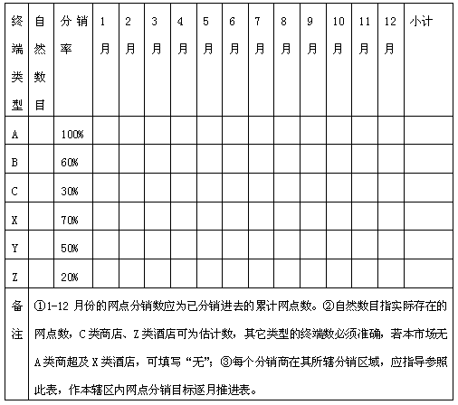 A、每家分銷商首次鋪市網(wǎng)點(diǎn)目標(biāo):根據(jù)當(dāng)?shù)貙?shí)際情況及分銷客戶實(shí)力而定,分銷商的下批視作終端零售商。參考網(wǎng)點(diǎn)數(shù)如下: