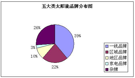 1)筆者將江蘇市場的太陽能品牌劃分為:一線專業(yè)太陽能品牌(包括華揚、皇明、清華陽光、輝煌、四季沐歌、億家能、力諾、天普等)、區(qū)域性太陽能專業(yè)品牌(包括桑夏、太陽雨、地球、日利達、元升、清華園、群升、桑樂、桑普、太陽寶等)、家電品牌(包括小天鵝、熊貓、光芒、華帝、澳柯瑪、揚子、阿里斯頓等)、地區(qū)性中小品牌(包括寧志、電工、金大唐、東方紅、中天等)及眾多的雜牌等五大類,其分別占有比例大約如下圖: