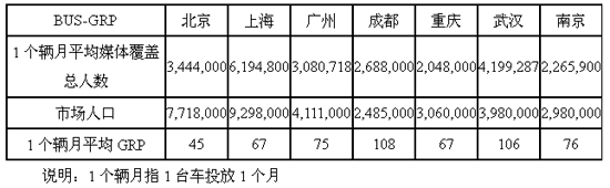 ,推及4歲以上電視人口總體,希望將公交車和電視媒體的覆蓋情況置于同一基礎(chǔ)。舉例來說,這里的“城市”并非地理意義的城市,而是指主城區(qū)或中心區(qū)。例如,上海的城市面積有6300平方公里,而本次研究所說的 “上!,是指外環(huán)線以內(nèi)670平方公里的區(qū)域,900多萬人口。即上海戶外媒體的有效覆蓋范圍在這900多萬人口。2004年央視-索福瑞媒介研究(CSM)涉及4歲以上上海的電視人口總量為930萬,MPI此次研究所定義的覆蓋情況與之相同。以此類推,此次研究共涉及30個(gè)主要城市。 發(fā)布量GRP