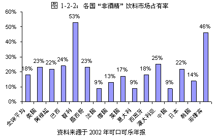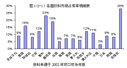 2002年可口可樂公司在全球非酒精飲料的市場(chǎng)占有率高達(dá)18%。其中,智利和菲律賓更是分別達(dá)到了53%和46%(見圖1-2-2)。