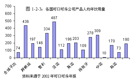 2002年全球可口可樂公司產(chǎn)品人均年飲用量已經(jīng)達(dá)到74杯(見圖1-2-3)。