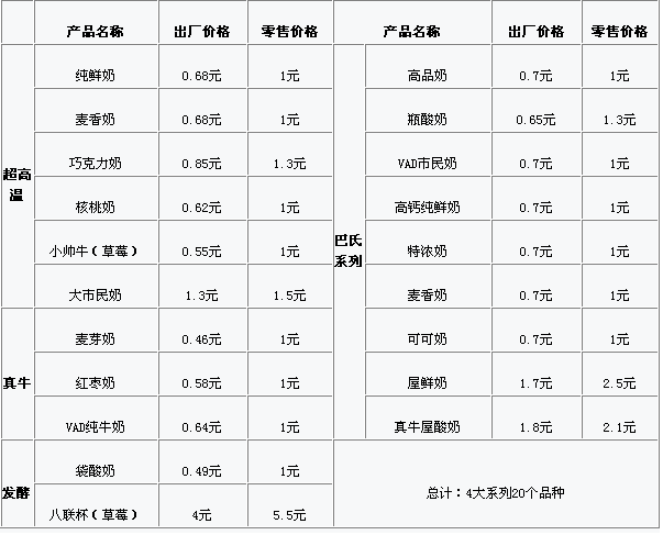 1、 超高溫系列(6種):純鮮奶、麥香奶、巧克力奶、核桃奶、小帥牛(草莓)、大市民奶。