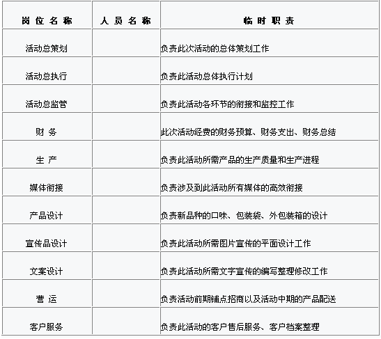 注:在此活動進行過程當中總策劃、總執(zhí)行、總監(jiān)管必須嚴格負責在規(guī)定時間內(nèi)各項工作的順利進行和各部門的有效銜接。