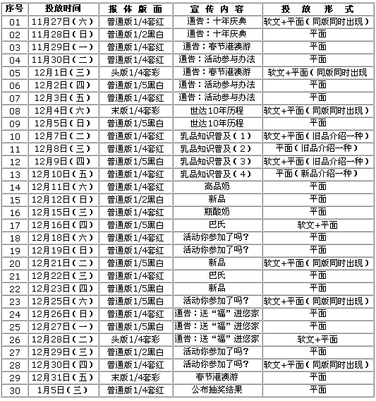 媒體軟文、平面廣告投放主題以及投放時間表: