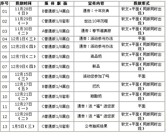 此活動的開展對我們企業(yè)“十年世達主題產(chǎn)品推廣活動”有很強的延續(xù)性,使我們整體的活動節(jié)奏感很強。我們活動的截止時間為12月31日而“送‘!顒印钡闹攸c時間在05年1月的春聯(lián)派送。我們企業(yè)的派送區(qū)域可以覆蓋石家莊整個市區(qū)重點是中高檔的生活社區(qū)(申請了投放區(qū)域保護,只有我們一家企業(yè)做市區(qū))。