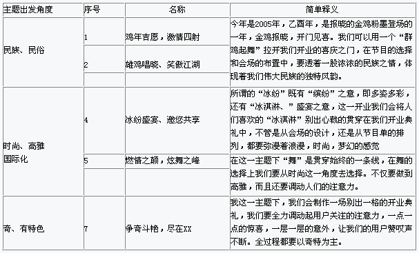 在與貴公司初次的接觸中,我們對(duì)貴公司有了一個(gè)簡(jiǎn)單的了解,由于時(shí)間較倉(cāng)促,我們?cè)陂_(kāi)業(yè)慶典的策劃上只是做了一個(gè)大體的策劃提綱。在進(jìn)一步對(duì)貴公司的了解中,我們會(huì)不斷的進(jìn)行完善。