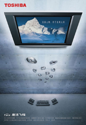 創(chuàng)意闡述:“高與美”,是核心的傳達(dá)信息。人生達(dá)到至高心境,方能領(lǐng)略世間的最美,而東芝也有一個(gè)“高與美”――至高的顯像技術(shù)演繹至美的畫面,創(chuàng)意將兩者結(jié)合,將功能訴求人性化,并且保證了一定的品味,提升品牌形象的高度。