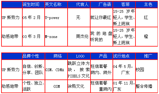 “動(dòng)感地帶”誕生兩年之后,中國(guó)聯(lián)通追隨“動(dòng)感地帶”的足跡比葫蘆畫瓢推出了“UP新勢(shì)力”(U-POWER)。(見表二)由于用戶(15-25歲的年輕人)重疊定位、提倡“共享”及過多的模仿痕跡,導(dǎo)致“UP新勢(shì)力”拋離了主流年輕人的群體特征,一時(shí)難以撼動(dòng)“動(dòng)感地帶”在年輕人通訊市場(chǎng)上的霸主地位!