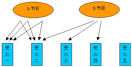 如上圖:A節(jié)目收視率為40%,B節(jié)目收視率為20%,X品牌分別在A節(jié)目和B節(jié)目投放三檔廣告。A節(jié)目的收視群體固定,收看A節(jié)目的觀眾總是同一群人(受眾一和受眾二),那么X品牌通過A節(jié)目投放廣告僅僅能接觸40%的受眾。而B節(jié)目的觀眾分別屬于三類不同的人群(受眾二、受眾三和受眾四),那么X品牌通過B節(jié)目投放廣告卻能接觸60%(20%×3)的受眾。這個例子說明,僅憑收視率的高低不能代表節(jié)目收視人口范圍的大小,如果需要廣告信息的高涵蓋率,必須引入到達率、重疊率等概念。