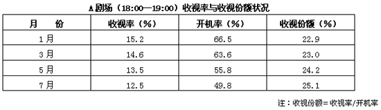 由上表可以看出,A劇場收視率逐月下降,如果以收視率作為評估標(biāo)準(zhǔn),會認為A劇場在慢慢失去觀眾,市場逐漸萎縮,當(dāng)導(dǎo)入開機率和收視份額這兩個測評指標(biāo)時就會發(fā)現(xiàn),A劇場的收視份額在逐漸提高,受歡迎的程度有增無減,而造成收視率下降的原因是開機率逐漸降低,開機率受到季節(jié)變換(冬季-夏季)的影響,夏季的到來,晝長夜短,觀眾開機時間向較晚時間段推移,位于較早時間段(18:00—19:00)的所有欄目的收視率均會有不同程度下降,隨著季節(jié)的交替(夏季—冬季),開機率逐漸提高,A劇場的收視率也會不斷回升。因此,對于受開機率影響較大的欄目,研究其生命周期時應(yīng)更注重檢視收視份額的增減而不是單純考慮收視率的高低。