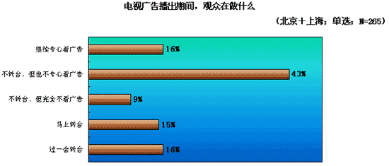 目前央視索福瑞提供的收視率報告只是節(jié)目收視率,而不是廣告收視率,但客戶所關(guān)心的恰恰是廣告多大程度上暴露于目標(biāo)受眾,所以在為客戶設(shè)定最低媒體傳送量時必須考慮到這個問題,將節(jié)目收視率轉(zhuǎn)化為廣告收視率。西方權(quán)威媒體調(diào)研機構(gòu)經(jīng)過多年的調(diào)查研究指出:收看電視節(jié)目的觀眾中平均有35%的人會看節(jié)目中的商業(yè)廣告。而實力媒體策略資源專項調(diào)研中對有關(guān)“電視廣告播出期間,觀眾在做什么”進行了更詳細的說明,如下圖: