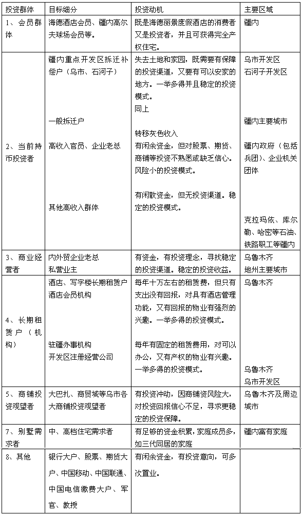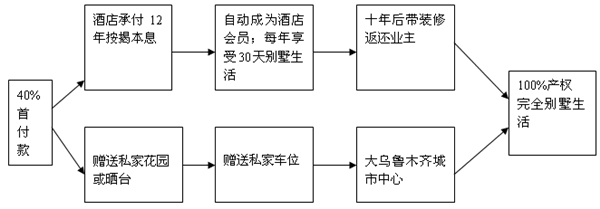其設(shè)想是,通過與新疆五星級(jí)酒店海德酒店合作,劃出部分別墅作為其“度假酒店”,將居住功能轉(zhuǎn)換為經(jīng)營功能,從而使購買別墅具有直接的投資意義。這樣就可在當(dāng)前投資商鋪熱而購買住宅冷的市場背景下,爭取商鋪投資者。這是基于當(dāng)前烏市中高檔住宅項(xiàng)目銷售趨冷,而商鋪投資出現(xiàn)熱潮的背景下提出的,具有廣泛的市場基礎(chǔ)。