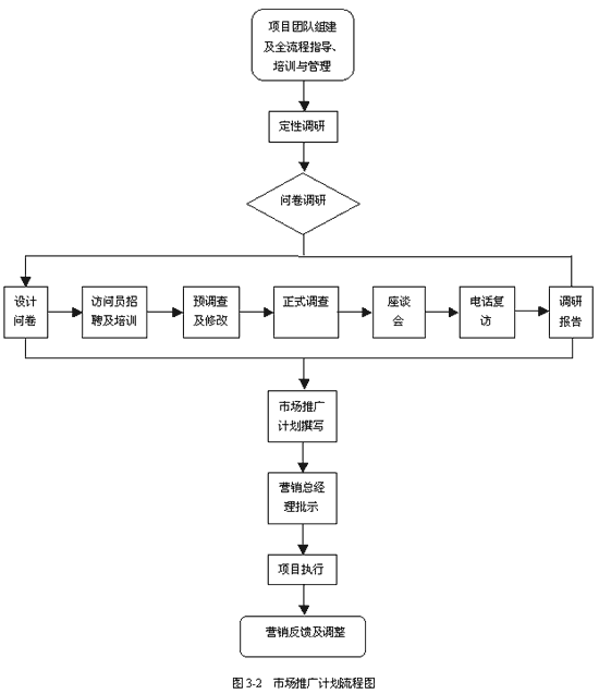 在以上幾方面的綜合分析基礎(chǔ)上,我們的調(diào)研團隊做出了以下的市場推廣計劃流程: