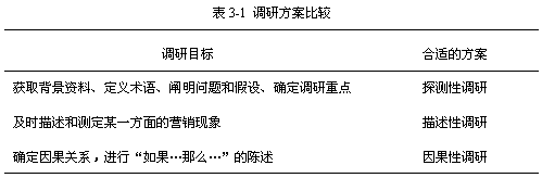 調(diào)研設(shè)計方案可歸納為三種傳統(tǒng)的類型:探測性、描述性和因果性。設(shè)計方案的選擇依賴于調(diào)研目標。一般而言,調(diào)研有三個目標:一是建立假設(shè);二是測定興趣變化的情況(如廣告和品牌忠誠度);三是檢驗假設(shè)。下表中我們將看到各種調(diào)研方案是如何最佳地處理這些基本的調(diào)研目標的。
