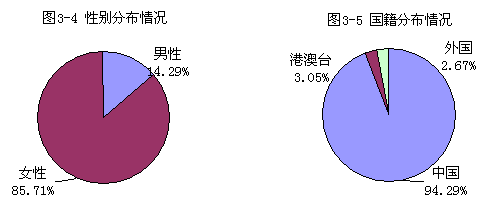 對于525個(gè)被調(diào)查人員,他們的性別、國籍和年齡分布情況如下。在被調(diào)查人員中,有450名女性,占總數(shù)的85.71%,其分布情況見圖3-4;其中,國內(nèi)大陸為495人,占總體的94.29%,港澳臺(tái)為16人,占3.05%,國外為14人,占2.67%,其分布情況見圖3-5。