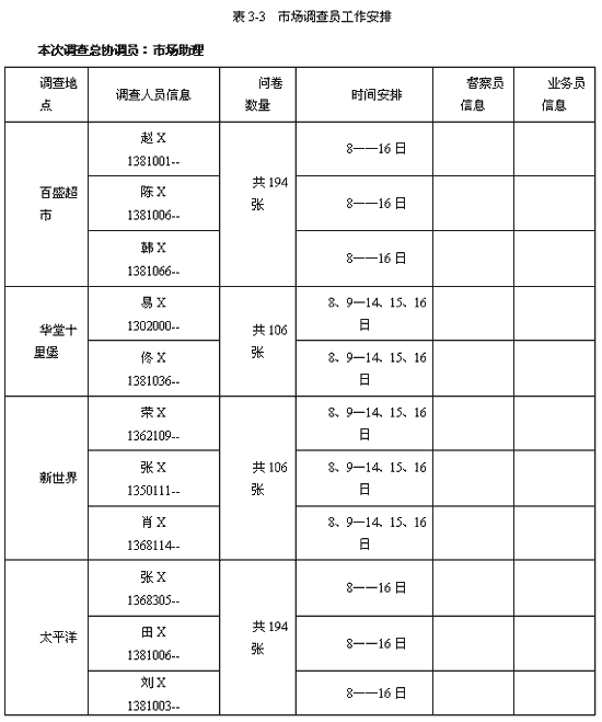 首先我們依據(jù)各調(diào)研場所的不同情況,對問卷的數(shù)量做出具體分配,這有利于保證樣本的完整性和代表性。在訪問期間,我們充分考慮到了訪問員上下班的路程和時(shí)間狀況,將訪問人員安排到相應(yīng)的地方開展訪問工作,更好喚起了他們的工作熱情。同時(shí),公司派出專人到各大訪問地點(diǎn)跟蹤檢查調(diào)研員的工作情況,以保證數(shù)據(jù)的真實(shí)性和調(diào)研效果。表3-3是某次調(diào)研的工作安排: