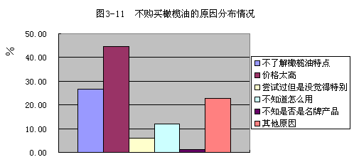 同時(shí),未購買橄欖油的原因調(diào)查也顯示價(jià)格相對較高是消費(fèi)者知道其優(yōu)點(diǎn)但仍未購買的主要原因(如圖3-11)。看來橄欖油要大規(guī)模飛入尋常百姓家、在中國普及還有待居民收入的進(jìn)一步提高。