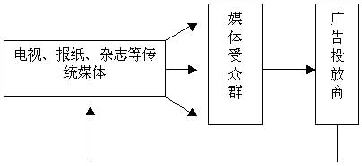 同樣作為大眾媒體,戶外媒體有許多不同于電視、報紙、雜志等其他傳統(tǒng)媒體的地方,尤其是在媒體、受眾和廣告投放商的三角關(guān)系上表現(xiàn)得比較明顯。這些傳統(tǒng)大眾媒體通常是進(jìn)行“二次販賣”,首先第一次販賣是要把自己的媒介產(chǎn)品直接銷售給廣大的受眾,在自身受眾群不斷增加和影響力擴(kuò)大以后,再將這種媒介資源出售給廣告投放商,進(jìn)行第二次的販賣,以獲得大大超越第一次販賣利益的廣告費;而由于戶外媒體是瞬間表達(dá)、三秒鐘的視覺閱讀、注意力的被迫投入,具有傳播的區(qū)域強(qiáng)制性和接受免費性,這樣的特性決定其不需要進(jìn)行二次販賣,可以直接的一次性銷售給廣告投放商,然后發(fā)布給廣大受眾,大眾的眼球成為戶外媒體的籌碼直接換取可觀的廣告費用。(見圖示一)