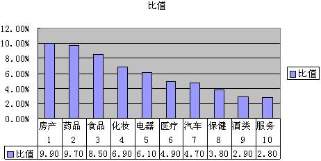 我們來進(jìn)行一個比較分析,以2004年度為例,首先來看全國廣告市場的投入分布情況分析數(shù)據(jù)統(tǒng)計,下表是2004年廣告投放前十的行業(yè)排名(圖示三):