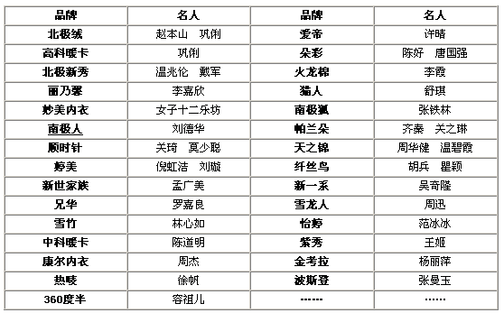 中國(guó)內(nèi)衣業(yè)品牌代言人列表(排名不分先后)