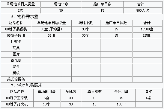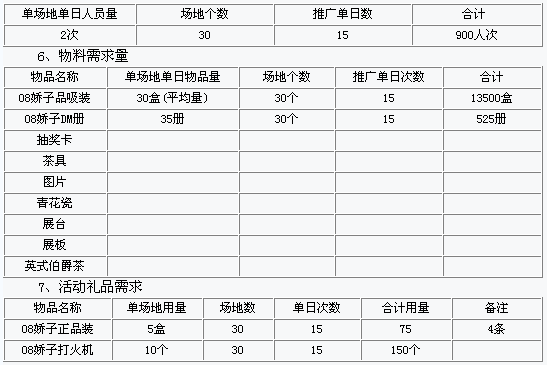 主持人一名,解說(shuō)員四名,促銷員兩名,工作人員三人(場(chǎng)地方提供)