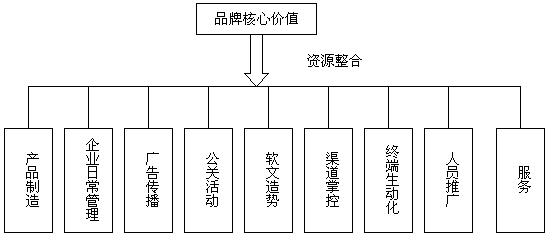 有很多品牌經(jīng)理人都認(rèn)為體現(xiàn)品牌核心價值的主要手段就是營銷策劃、廣告創(chuàng)意、公關(guān)活動與終端促銷等等。但是,筆者卻對此種說法不盡認(rèn)可。打造品牌核心價值的過程說到底應(yīng)該是以品牌定位為中心,對企業(yè)的一切資源進(jìn)行整合,并以此為整體經(jīng)營活動的指導(dǎo)原則,使每一項日常工作都向品牌核心價值靠攏,最終為品牌加分的一個全過程。如下圖所示: