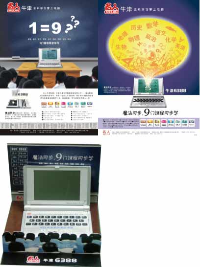 很快,包括FLASH電視廣告在內(nèi)的宣傳資料和終端物料就出現(xiàn)在了終端上,不僅如此,我們的設(shè)計(jì)師還根據(jù)我們廣告的主畫面,設(shè)計(jì)了一個(gè)獨(dú)特的產(chǎn)品托架<見圖片X>,獨(dú)特的造型讓消費(fèi)者一到終端就可以在柜臺(tái)內(nèi)看到一群學(xué)生探著頭注視著我們的全科老師――6388,不需營(yíng)業(yè)員介紹,消費(fèi)者只要看一眼我們擺在托架上的產(chǎn)品,就能明確的知道6388的主要功能。