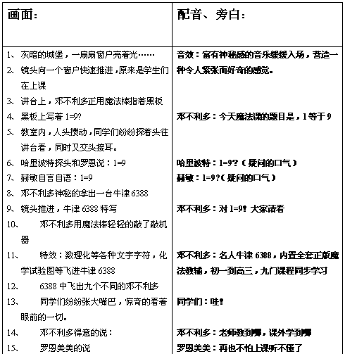根據(jù)上述的幾大要素,我們分別創(chuàng)作了“黑板篇”、“1=9篇”“魔法篇”等三個(gè)平面廣告,并將魔法教輔的魔法和學(xué)生喜聞樂見的哈里波特結(jié)合起來,用FLASH這種學(xué)生喜聞樂見的新方式,創(chuàng)作了“哈里波特版”電視廣告: