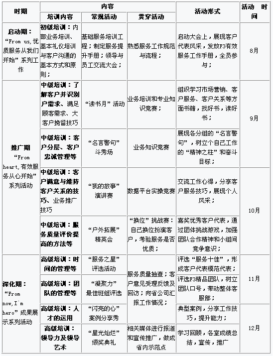 提升一線客服代表的業(yè)務操作及服務能力、提高其綜合素質(zhì),通過活動始終提倡團隊精神的重要性,以提升大客戶中心凝聚力。案例教學將是貫穿全年的重要課題,有助于讓員工養(yǎng)成互相交流經(jīng)驗的習慣。開展明星事跡演講賽有助于表揚先進、樹立標桿,深化企業(yè)文化。營造和諧的心學習氛圍,提升全員素質(zhì),促進品牌由內(nèi)而外的提升。