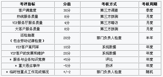 以考評促進服務提升工程的開展,因而完整的考評體系的必要的。以下方案由考評指標的確定、考評方式、考核周期及相應所占考評分值的規(guī)劃建立了一整套的考評體系。