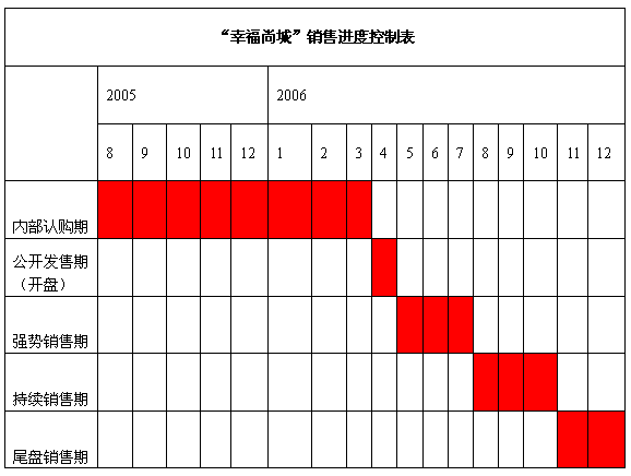 1、根據(jù)烏魯木齊未來兩年的市場競爭環(huán)境情況,我們擬定本項(xiàng)目從一期接受預(yù)訂(2005年8月)至二期掃尾期(2006年12月)結(jié)束先后共計(jì)17個(gè)月;
