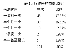 從表中我們可以獲知,采購者采購服裝的頻率比較高,他們一般都是一個星期和半個月采購一次,而這一類型的采購者占絕大多數(shù)。其實,這與服裝銷售市場有著密不可分的聯(lián)系,在服裝銷售市場當中,大多數(shù)都是個體經(jīng)營,營業(yè)規(guī)模比較小,資金比較少,一般都是能夠銷售多少就采購多少,不存貨,當季衣服當次賣。這樣他們的資金周轉率比較高,經(jīng)營方式靈活,能夠迅速收回成本,減少經(jīng)營風險。在調查中也發(fā)現(xiàn),采購者采購服裝的批量都比較少,一般都是用拖車在市場采購服裝。這樣多批次,少批量的方式增加服裝的經(jīng)營成本。他們采購服裝的頻率見表1: