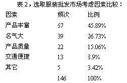 調查顯示,在您選擇服裝批發(fā)市場的依據(jù)這個問題當中,大多數(shù)采購者選擇產(chǎn)品豐富,其次是名氣大,再次是產(chǎn)品質量。這一結果表明,采購者喜歡到那些產(chǎn)品豐富,能夠滿足在一個地方購足所有的服裝的地方進行采購,喜歡一站式購物的方式,其中白馬、虎門等綜合性批發(fā)市場成為他們采購的主要場所,這兩個市場產(chǎn)品層次全,經(jīng)營各種女裝、男裝,套裝、晚裝、休閑裝、唐裝,襯衫、外套、大衣、內衣等,能夠滿足他們對各種服裝的需要。采購者選取服裝批發(fā)市場看中的因素排序見表2: